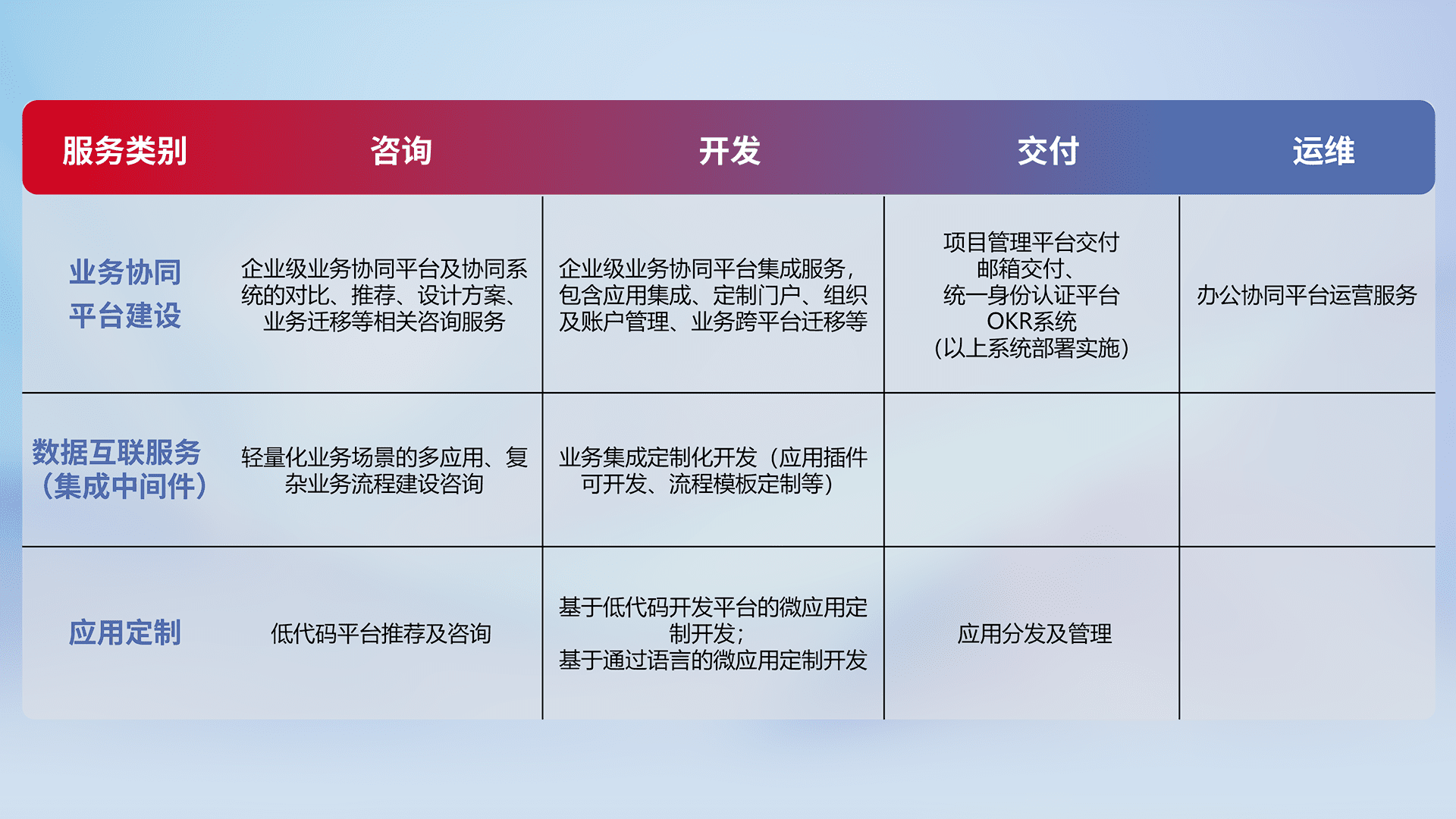 针对钉钉、、企微、、、IDaas等平台级产品提供产品的规划、、方案、、、、交付、、定制化开发等服务,,实现如统一协同办公、、、智能客户服务、、、、混合会议管理、、、、智能数据查询、、、等业务场景,,实现数字化转型。。